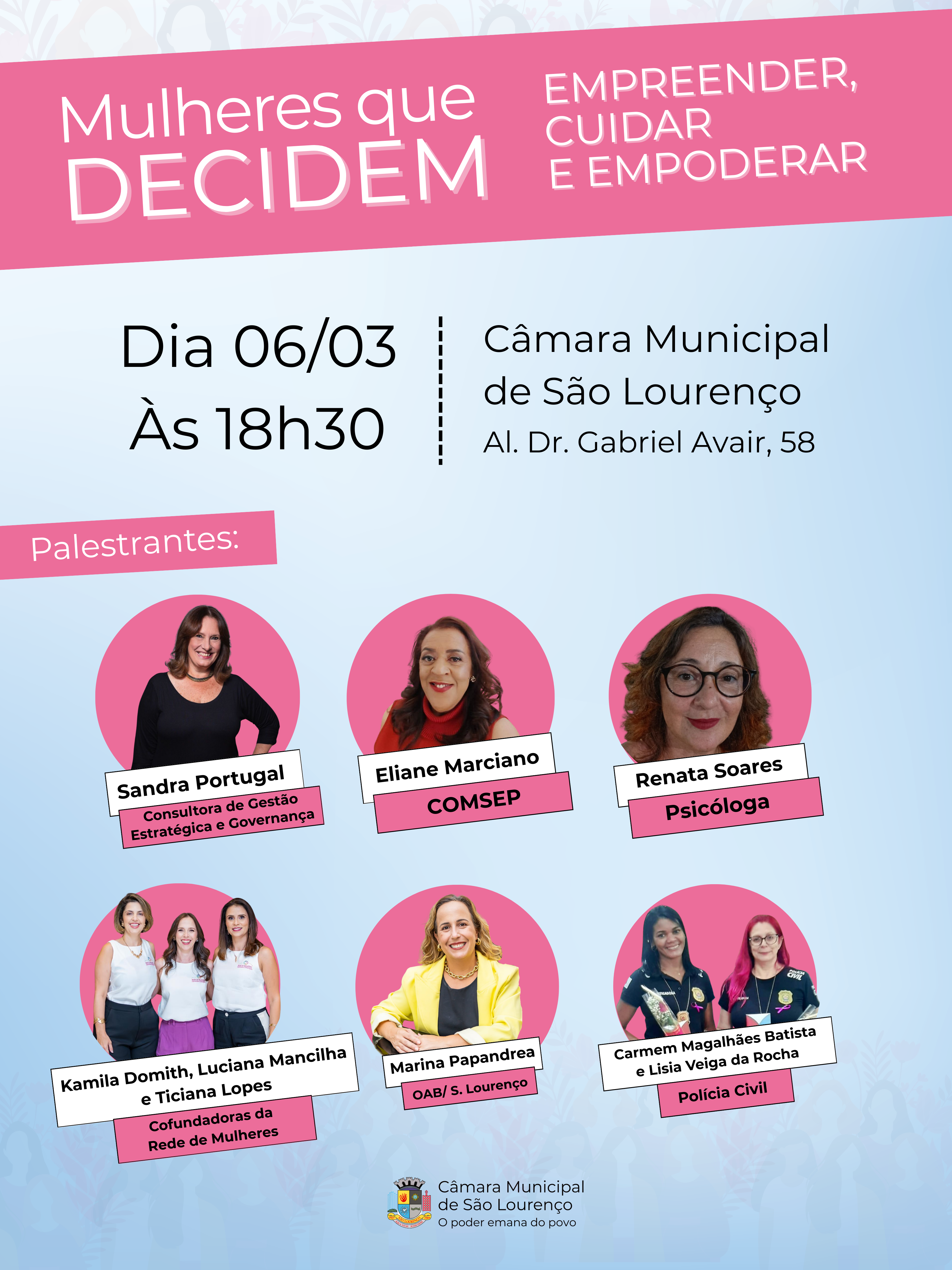 Participarão do ciclo de apresentações: Sandra Portugal, Consultora de Gestão Estratégica e Governança; Eliane Marciano, do Conselho Comunitário de Segurança Pública;  a psicóloga Renata Soares;  Marina Papandrea, da OAB/São Lourenço; Carmen Magalhães Batista e Lisia Veiga da Rocha, da Polícia Civil; Kamila Domith, Luciana Mancilha e Ticiana Lopes, cofundadoras da Rede de Mulheres.